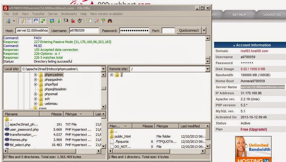 Pada member area anda diminta untuk memasukan username/email, password untuk masuk ke account cpanel 000webhost.com, setelah masuk maka status dan action seharusnya akan berubah, saya asumsikan bahwa sampai tahap ini anda tidak mengalami masalah dan anda dapat melanjutkan ke tahap selanjutnya yaitu mengupload file – file website anda ke public_html. kemudian catat hal hal penting di bagian kanan Cpanel, seperti username, server name dan password, nantinya itu akan berguna untuk melakukan ftp yang membutuhkan autentifikasi user