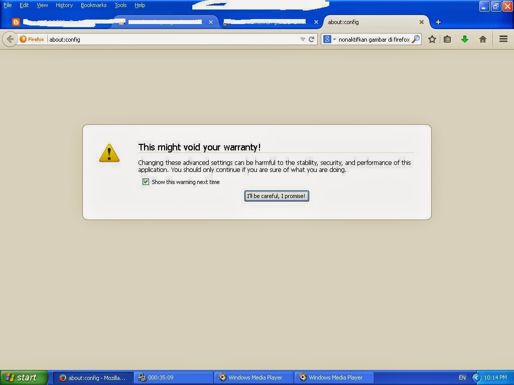 1. Buka Firefox. Kemudian di address bar tulis about:config. Kemudian nanti kan muncul tampilan seperti dibawah ini