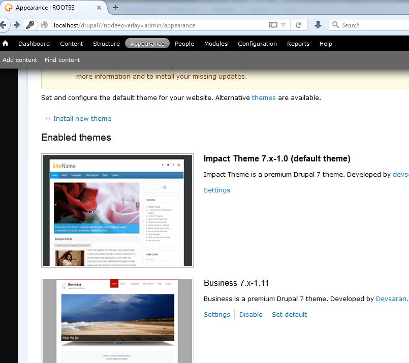 Bila template sudah dicopykan kedalam folder site/all/theme selanjutnya kita kembali ke menu administrator drupal. Klik Appearance maka template sudah terpasang klik enable dan set default