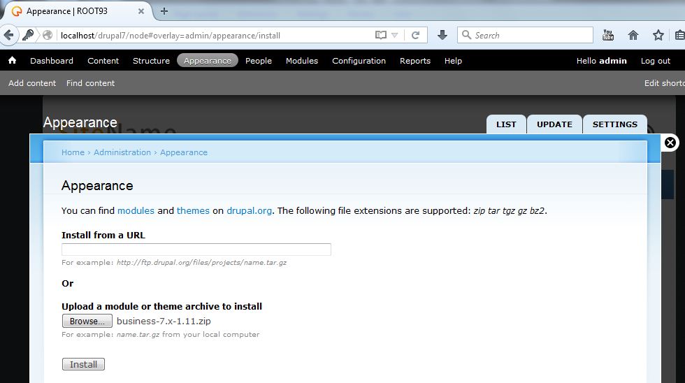 Caranya : Masuk ke Halaman Administrator Drupal Klik Menu à Appearance à Install new theme à klik browse lalu cari templatenya dalam format zip (tidak usah diextract dulu) Klik Install dan template akan langsung terpasang