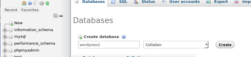 Buka web browser dan masuk ke http://localhost. Klik PhpMyadmin lalu Klik New dan masukan nama databse barunya lalu Klik Create.