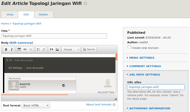 Seperti yang terlihat pada gambar diatas bahwa url yang dibuat oleh Drupal 8 untuk artikel dengan judul "Topologi Jaringan Wifi" adalah http://localhost/blogku/node/4. Menurut Saya URL tersebut tidak SEO Friendly sehingga kita perlu merubahnya. Untuk Membuat URL yang Seo Friendly di Drupal 8 caranya cukup mudah