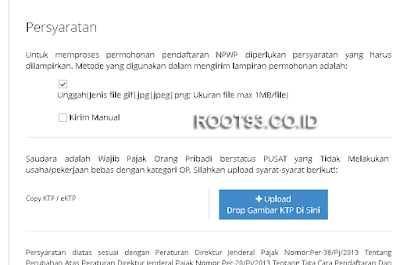 8.  Point penting dalam pengisian form ini menurut Saya adalah pad poin persyaratan, disini Saya hanya cukup mengunggah file scan KTP, ingat file sacan jangan terlalu besar. Berdasarkan pengalaman, Saya pernah mencoba mengunggah file scanan KTP dengan ukuran 317,0KB dan hasilnya file KTP tidak berhasil diunggah, akhirnya Saya coba perkecil menjadi 33 KB dan hasil file berhasil diunggah. Saya kurang tahu secar pasti berapa ukuran maksimal unggah gambarnya, karena di aplikasi tidak ada keterangannya, selain itu halaman Help dan FAQ pada aplikasi NPW/Pajak juga statusnya dalam keadaan Under constrution. Baca :