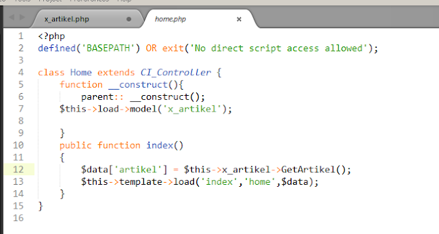 Jika modelnya sudah dibuat maka langkah selanjutnya adalah mengatur controller dari masing – masing file supaya di load. Pada folder controllers sudah dibuat file home.php dan tentang.php maka tinggal tambahkan fungsi untuk memanggil file yang ada.